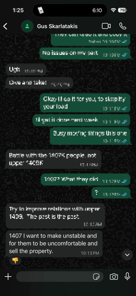 Here is a conversation with Gus Skarlatakis who works for Crescent Real Estate, talking to a Tenant about making things unstable for the house next door so he could take over the place