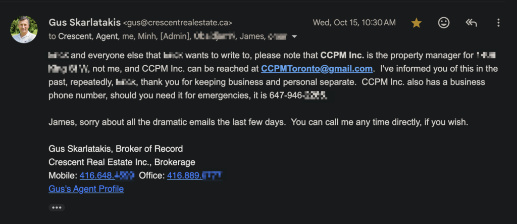 {Omitted} and everyone else that {Omitted} wants to write to, please note that CCPM Inc. is the property manager for {Omitted Address}, not me, and CCPM Inc. can be reached at [email protected]. I’ve informed you of this in the past, repeatedly, {Omitted} , thank you for keeping business and personal separate. CCPM Inc. also has a business phone number, should you need it for emergencies, it is 647-946—–. James, sorry about all the dramatic emails the last few days. You can call me any time directly, if you wish.
